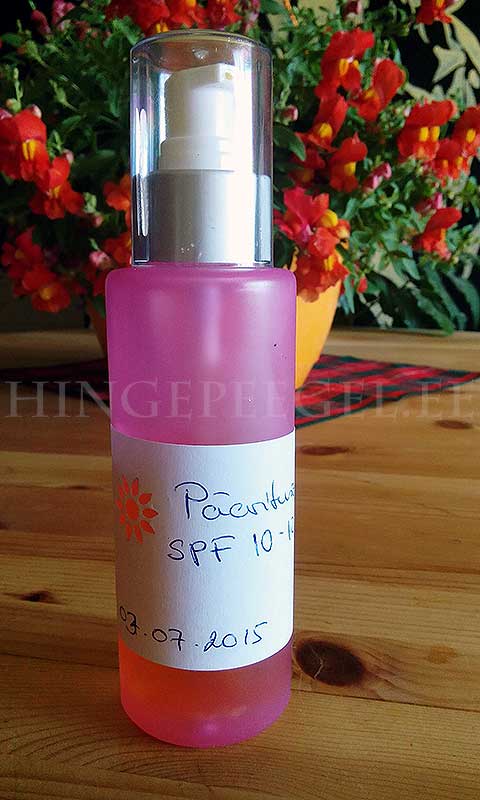Kui kasutad oma segus kookosõli/rasva, siis arvesta sellega, et kookosõli on vedelal kujul ainult siis, kui õhutemperatuur on üle 24 C. Ja kui õhutemperatuur on madalam, siis ei pruugi su segu toimida, sest kookosrasv on põhjas tahkel kujul. Sellisel juhul soovitan teha segu laiema suuga purki. Sega kõik koostisained omavahel korralikult läbi, vala saadud segu pump- või spreipudelisse. Kui kasutad micat, siis spreipudel ei tööta, sest mica pulber jääb pihustisse kinni.