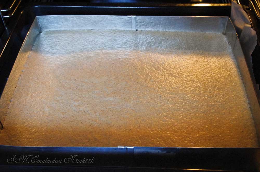 Eelkuumuta ahi 175-180 C kraadi peale – mina teen seda samal ajal vahustamise käigus. Kui sul on köögikombain, siis löö 10 muna köögikombaini ja lisa 5 sl suhkrut. Vahusta paksuks ja tugevaks vahuks. Kui sul aga köögikombain puudub, löö munavalged eraldi kaussi ja rebud teise. Vahusta munavalged 3 sl suhkruga vahuks 3 sl suhkruga ning rebud 2 sl suhkruga samuti ilusaks heledaks ja tugevaks vahuks. Sega kaks vahtu omavahel kokku. Kui oled saanud ilusa ühtlase ja koheva vahu, sega sisse (mikseri või kombainiga madalal kiirusel) 9 sl mandlijahu. Mina kasutan Umamist ostetud õlivaba mandlijahu, mis on oma olemuselt tolmjas ning kuiv. Tavaline mandlijahu on selline niiskem ja õline. Kalla saadud mass küpsetuspaberiga kaetud kõrgete äärtega ahjuplaadile. Kui sinu ahjuplaadil puuduvad kõrged ääred, siis võid kasutada ka spetsiaalset kõrgete äärtega vormi. Minu plaadil on kõrged ääred, aga mulle meeldib saada konkreetsete äärtega kook ja seetõttu kasutan isegi seda põhjata lisavormi.