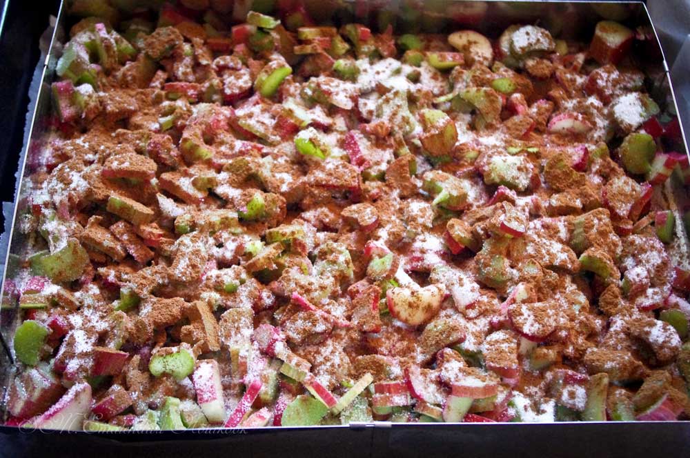 Jaga rabarber ühtlaselt põhjale ning raputa peale ca 8 sl suhkrut (kui soovid magusamat, lisa rohkem, aga minu jaoks on rohkem juba liiga magus). Siis raputa peale veel kaneel, kogus oleneb sellest, kui kaneelist kooki saada tahad. Mina kaneeliga ei koonerda ja panen seda tunde järgi ning helde käega.