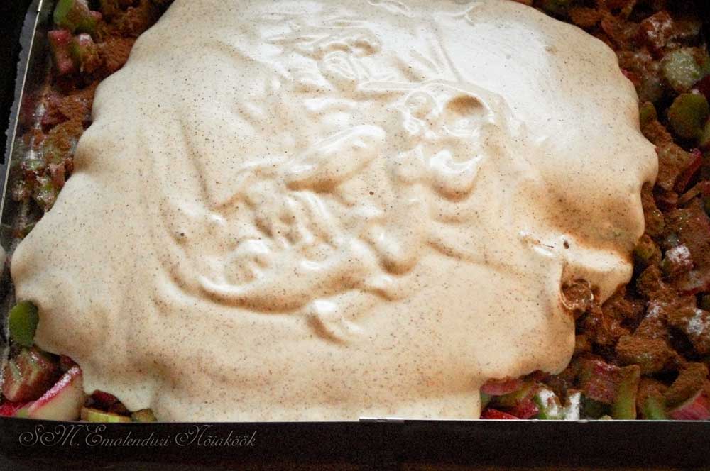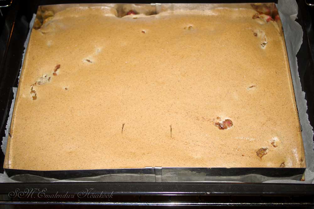 Vala ülejäänud segu rabarberitele ning jaga see ühtlaselt koogile laiali ja aseta kook ahju