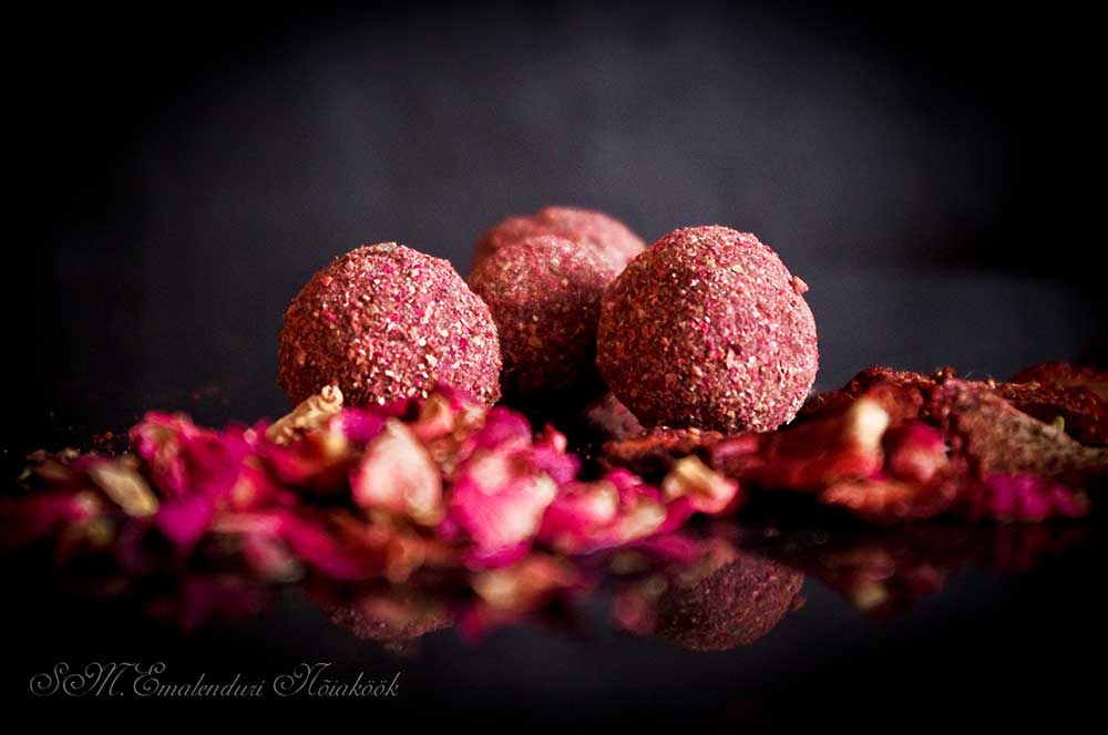 Valmis mass on liivatainga laadne, tugev, aga samas hästi vormitav ja voolitav. Kui mass voolimise käigus käes pudeneb, siis vajad veel veidi mett. Vormi saadud massist ümmargused enamvähem ühesuurused pallikesed ning veereta neid kõrvale asetatud ning kokku segatud roosi-maasikajahus.