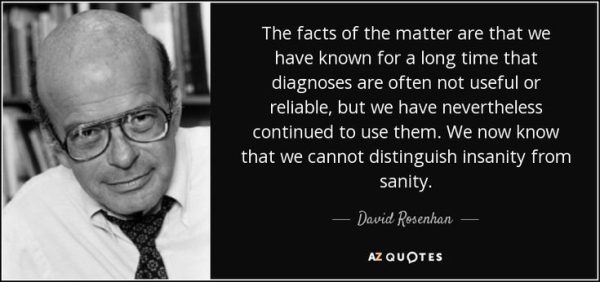 - aastal avaldatud Rosenhani uuring viitas sellele, et psühhiaatrilised diagnoosid on sageli subjektiivsed ja ebausaldusväärsed. Rosenhan ja tema kaaslased teeseldasid hallutsinatsioone, et pääseda vaimuhaiglatesse, kuid käitusid pärast vastuvõttu igati tavapäraselt.