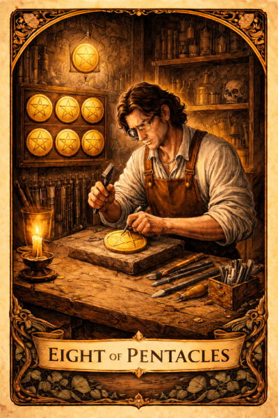 Müntide kaheksa on meisterlikkuse kaart, mis sobib hästi oma valdkonnas oskuste lihvimiseks ja sihikindlaks pürgimiseks tipptaseme poole. Enne iga tööpäeva algust süüta küünal ja vaata kaarti, kujutledes end selle sees. Olenemata sellele, millega sa tööalaselt tegeled, kujutle end oma ala meistrina.