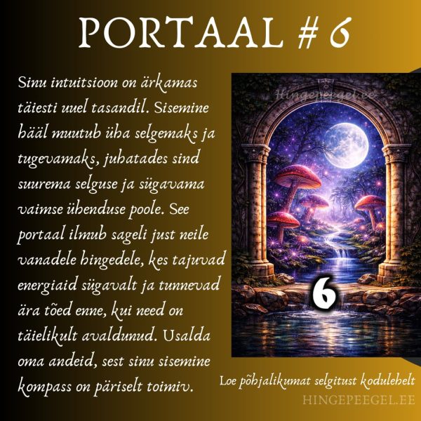Kui valisid endale just kuuenda portaali, tähendab see, et sinu intuitsioon kogub jõudu ning on muutumas üha tugevamaks. Seda peetakse vaimse ärkamise, intuitiivse tajumise ja kõrgema juhatuse portaaliks.